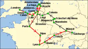 El mapa muestra el gran viaje, de 1763 a 1766. La línea negra muestra el viaje de ida hacia Londres, entre 1763 y 1764. La línea roja muestra el viaje de vuelta a Salzburgo, entre 1765 y 1766. La línea superpuesta muestra el viaje en ambas direcciones.