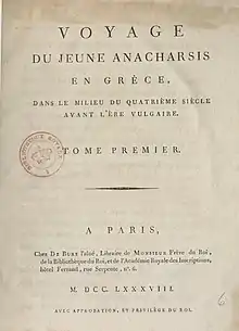 - Livre:Barthélemy - Voyage du jeune Anacharsis en Grèce vers le milieu du IVe siècle, tome 1.djvu. Libro en francés en Wikisource.