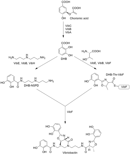 DHB-NSPD Y DHB-Thr-VibF es conjugado por VibF para formar la vibriobactina.[4]