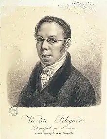 Como litógrafo, antes de disponer de su propia litografía, debió de formarse en el Establecimiento litográfico del Depósito General de la Guerra, instalado en Madrid hacia 1822 bajo la dirección de José Ribelles y Palomar, oficial del ejército y también valenciano, pues dentro del exiguo catálogo de obras salidas del establecimiento en su corta vida dos llevan la firma de Peleguer: el retrato de Antonio Remón Zarco del Valle, fechado en Sevilla en 1823, a donde hubo de trasladarse el establecimiento, acompañando a la salida de la corte de Madrid por la invasión de los Cien Mil Hijos de San Luis,[3] y el retrato de Francisco Javier Venegas, marqués de la Reunión, con la inscripción «Dibujo por V. Peleguer, Litografía del Deposo Genrl de la Guerra dirigida por J. Ribelles».[4] En 1827, el mismo año en que José de Madrazo obtuvo del rey la concesión de una exclusiva por diez años para su Real Establecimiento Litográfico alegando que los grabados que salían de los establecimientos particulares eran tan imperfectos que solo podían considerarse como ensayos, Peleguer tenía en Madrid su propia litografía, como hacía constar en su autorretrato, con el que concurrió junto con otras piezas salidas de su taller a la Exposición de los productos de la Industria Española celebrada ese año, en la que obtuvo medalla de plata —la misma que el Real Establecimiento de Madrazo— con un «honroso y expresivo encomio» por parte del jurado.[5]