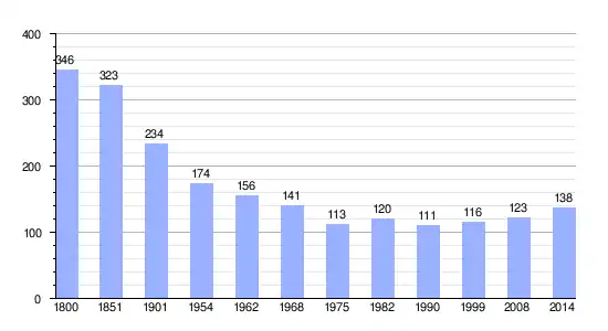 Los datos demográficos contemplados en este gráfico de la comuna de Vidouville[4] se han cogido de 1800 a 1999 de la página francesa EHESS/Cassini, y los demás datos de la página del INSEE.[5]