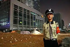 Un vigilante de seguridad prestando servicio en un edificio en construcción en China.