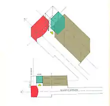 A. Configuración Genérica: Una organización que es posible desplazar en un terreno tan pequeño y escondido, configura la forma de la casa en L alrededor del fondo del eje de la casa; Como resultado se genera un bloque lineal, paralelo a la plaza, con una ampliación que resulta siendo el remate del mencionado eje.