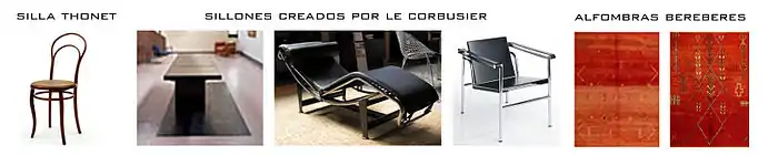 El mobiliario presente en la casa ha sido concebido o seleccionado por Le Corbusier. En su mayor parte, el almacenaje está constituido por elementos encastrados. Algunos muebles vienen a completar estos espacios funcionales: silla Thonet, sillones Maple, mesas La Roche diseñadas por Le Corbusier, alfombras bereberes, mobiliario de jardín. Algunos de ellos se han incorporado a posteriormente, notablemente el sillón con respaldo basculante de 1930 (creación de Le Corbusier, Pierre Jeanneret y Charlotte Perriand) y el sillón Grand Confort modelo pequeño. El interés que Le Corbusier aporta al amoblado de la vivienda será una constante en sus investigaciones posteriores.