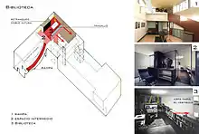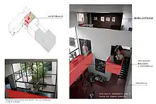 Lugar de estudio y contemplación, está situada en el último nivel de la casa. A continuación de la rampa, la biblioteca es un espacio retirado que domina el enorme vacío del vestíbulo, teniendo una vista privilegiada de los 3 niveles. Una doble exposición proporciona una iluminación natural propicia a la lectura, por un lado el tragaluz que está situado al centro de la biblioteca y el mismo vestíbulo, el cual ilumina los 3 niveles. Por último una estantería en hormigón destinada a albergar los libros de arte constituye la barandilla.