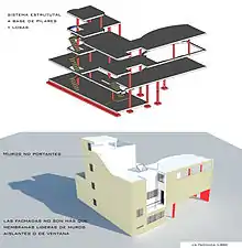 Con la construcción tradicional, los muros de carga condicionan la organización interior de cada nivel de la vivienda. A partir de ahora, la utilización del hormigón armado libera la planta, los pisos ya no se superponen mediante las divisiones. Así, es posible disponer las particiones según las necesidades de la distribución interior.