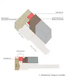 C. Contraste el potencial del contraste se pone en manifiesto al colocar un volumen mayor a ras de suelo ( con una altura necesaria para acoger el programa), mientras que el menor se levanta para crear una especie de pabellón que permite la prolongación del eje vial; Este pabellón responde a la presencia del eje principal exterior a través de la fachada curva, como también lo logra el pilar cilíndrico que marca dicho eje en la planta baja.