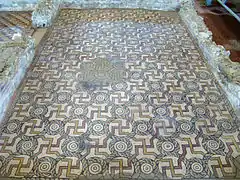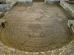 - Mosaico en que puede apreciarse la mancha dejada por una hoguera en los tiempos de abandono de la villa.