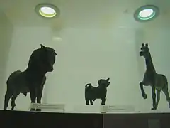En la parte norte del complejo y debajo de la estructura de protección se aprovecharon unos espacios para colocar unas escenas figuradas de obreros y ayudantes trabajando en la confección de los mosaicos. Pueden verse los utensilios empleados así como la materia prima, pigmentos y teselas ya preparadas para su colocación.