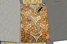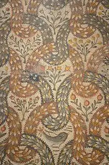 - 1. El primero sería el cuadro central que para los excavadores sería el que ha sido ejecutada con mayor cuidado y con mayor riqueza de elementos decorativos. El cuadro central se compone a su vez en dos partes: La interior tiene como protagonista un jarrón que es sostenido por dos putti, sin indicación de sexo, y sobre el jarrón dos palomas, todo esto dentro de una guirnalda de hojas y frutos. En los ángulos de la parte interior hay canastitos de los que sobresalen unos frutos redondos. Para los excavadores “el dibujo de los dos putti es torpe, dando a las caras un aspecto caricaturesco, sin duda no buscado intencionalmente.”[11]