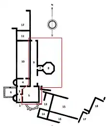 En esta habitación los excavadores apreciaron restos de pinturas murales polícromas donde no pudieron adivinar los temas de la pintura.
