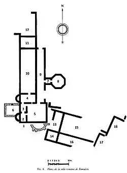 El conjunto arqueológico de la villa está formada por 18 habitaciones, de las cuales, casi la mitad han sido principalmente investigadas, centrándose sobre todo en los hipocaustos y los mosaicos.