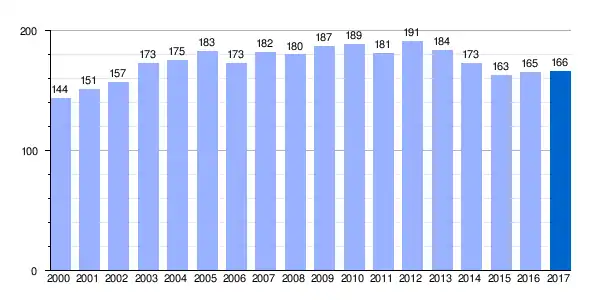 Gráfica de evolución demográfica de Villafranca de Estíbaliz[2] entre 2000 y 2017 |