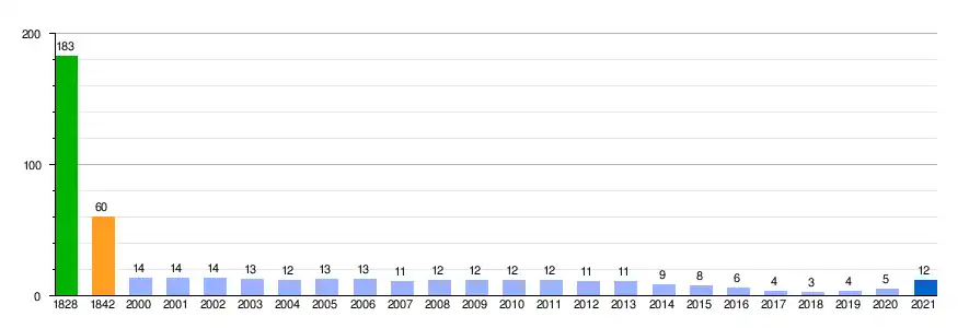 Gráfica de evolución demográfica de Villalvilla de Montejo[1] entre 1828 y 2021 |