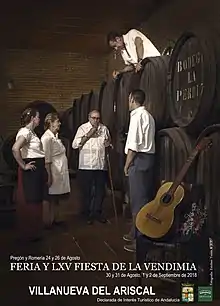 - Feria y Fiesta de la Vendimia: Declarada de Interés Turístico de Andalucía, la Fiesta de la Vendimia tuvo su comienzo en el año 1954 a iniciativa de un alcalareño afincado en Villanueva, José Santos Piña, corresponsal de prensa (el Ayuntamiento en el pleno celebrado el 24 de noviembre de 2003 le dedicó una calle). Suele celebrarse a finales del mes de agosto y principios del mes de septiembre de cada año y nació con la finalidad de dar a conocer en el mercado nacional los vinos locales. Con tal motivo se organizan distintos actos paralelos a la feria:Cartel Fiesta de la Vendimia 2018