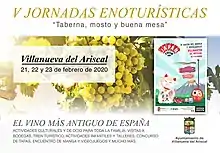 - Cabalgata de Reyes Magos (5 de enero): Es una cabalgata con fama extendida por toda Sevilla debido a su organización y sus particularidades. Se tiran más de cuarenta kilos de chacina envasada -jamón, caña de lomo, queso, ...- e incluso langostinos, además de 40.000 juguetes, con peluches de todos los tamaños, 20.000 balones y 15.000 kilos de caramelos. La fiesta está organizada por una Asociación sin ánimo de lucro e independiente del Ayuntamiento de la localidad, de la que forman parte veintitrés personas.Cartel de las V Jornadas Enoturísticas y Japan Tour.
