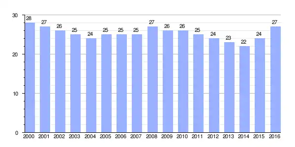 Gráfica de evolución demográfica de Villapodambre[2] entre 2000 y 2016 |