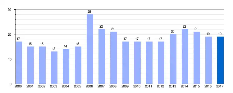 Gráfica de evolución demográfica de Villar del Maestre entre 2000 y 2017 |
