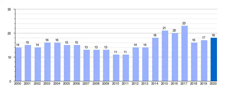 Gráfica de evolución demográfica de Villarmentero de Campos entre 2000 y 2020 |