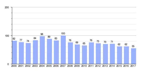 Gráfica de evolución demográfica de Villarrubín[2] entre 2000 y 2017 |