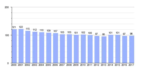 Gráfica de evolución demográfica de Villaverde de Sandoval[2] entre 2000 y 2017 |