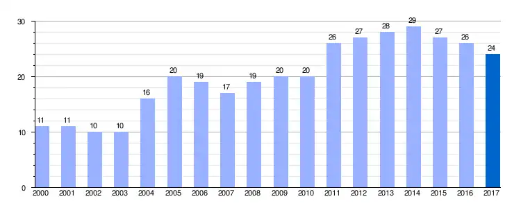 Gráfica de evolución demográfica de Villaverde de la Cuerna entre 2000 y 2017 |