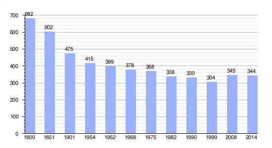 Los datos demográficos contemplados en este gráfico de la comuna de Villers-en-Ouche[4] se han cogido de 1800 a 1999 de la página francesa EHESS/Cassini, y los demás datos de la página del INSEE.[5]