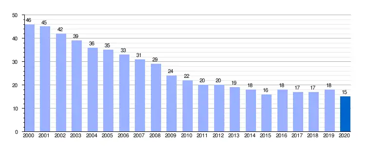 Gráfica de evolución demográfica de Villodre entre 2000 y 2020 |