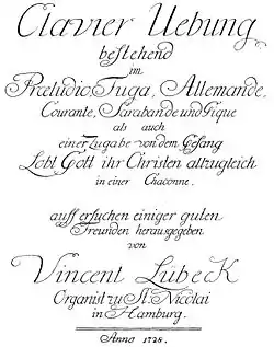 - Clavier Übung bestehend im Praeludio, Fuga, Allemande, Courante, Sarabande und Gigue als auch einer Zugabe von dem Gesang Lobt Gott ihr Christen allzugleich in einer Chaconne (Hamburgo, 1728):