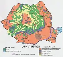 Mapa del uso del suelo en Rumanía en 1970: los viñedos aparecen en color púrpura.