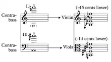 - 1 violín con scordatura (todas las cuerdas 69 cents más altas de lo normal, así la cuerda del violín I debe afinarse con el séptimo armónico parcial de la cuerda I del contrabajo)