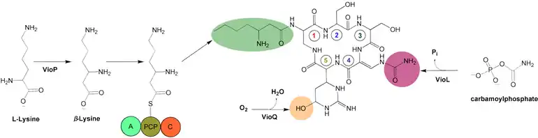 Luego de la desaturación α,β vía, ocurren tres modificaciones a la estructura cíclica preliminar. La hidroxilación de C-6 en la estructura es llevada a cabo por la VioQ, la N-acilación del grupo α-amino utilizando β-lisine, por medio de VioO, y VioM; y la carbamoilación de grupo β-amino, produciendo β-ureidoalanina (β-Uda) por la homóloga de carbamoiltransferasa VioL.