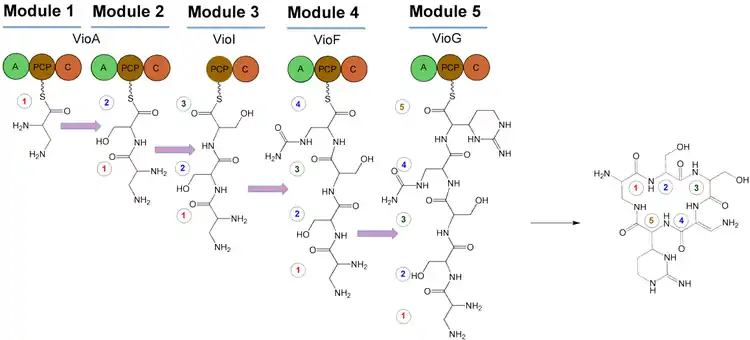 El siguiente es el mecanismo de biosíntesis propuesto para la viomicina utilizando la síntesis peptídica catalizada por la NRPS. Hay cinco dominios proteicos responsables de la síntesis del pentapéptido, incluyendo uno que carece de un dominio de adenilación (A). Por lo cual se ha propuesto que otro de los sitos de adenilación es capaz de funcionar dos veces. Adicionalmente, se sospecha que las subunidades de la NRPS no funcionan en el orden en que se encuentran codificadas sobre el arreglo de genes, una característica de la biosíntesis de la viomicina que es muy diferente a otras síntesis típicas de péptidos catalizadas por NRPS.[4] Los componentes de la NRPS funcionan en el orden VioA→VioI→VioF→VioG para poder llevar a cabo la incorporatción de β-ureidoalanina (β-Uda). El primer dominio A de la VioA crea un intermediario L-Dap-PCP en el primer dominio PCP. Mientras tanto, el segundo dominio A de VioA carga una L-Ser en el segundo dominio PCP, como así también el PCP de VioI. La activación de la β-Uda ocurre vía VioF, y la VioG incorpora a la L-Cam.