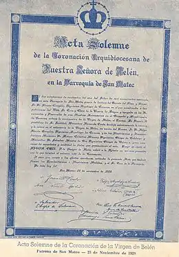 Atendiendo a la solicitud del Pbro. Luis Rafael Romero, cura de San Mateo, y de otros párrocos y fieles de las comarcas del valle de Aragua, el Ilustrísimo Señor Arzobispo de Caracas, con fecha; 10 de noviembre de 1927, decretó la Coronación Arquidiocesana de la milagrosa imagen de Nuestra Señora de Belén.