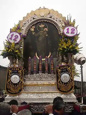 En el Perú, como un homenaje a la cuna de nacimiento de sor Antonia Lucía del Espíritu Santo, se decidió colocar este lienzo para acompañar al Señor de los Milagros en la parte posterior de las andas sagradas el 20 de octubre de 1747. Ambas salen en procesión multitudinaria en Lima en el mes de octubre. Muestra a sus pies, en posición orante al obispo favorecido de su mano, Sancho de Andrade y Figueroa, y sobre el terreno se observa una pequeña iglesia, que algunos identifican como la parroquia de Guápulo o el santuario de Las Nazarenas.[4]