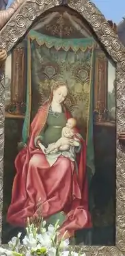 La Virgen, está sedente bajo un dosel de brocado, contemplando al Infante en sus brazos. Aparece vestida con una túnica de cuello cuadrado y cintura alta con un manto rojo y tocada con un velo transparente.
