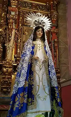 Es una imagen en la que se muestra a la Virgen con la mirada hacia el frente y caída, cubierta por un largo ropaje y manto bordado en colores dorados de manera artesanal. No aparece con la figura del Niño Jesús, en su lugar lleva un rosario y un escapulario, y a sus pies cabezas de querubines. Destaca su corona plateada con aureola. La figura se sitúa en un retablo barroco sobre un tronco de árbol. Cada 8 de septiembre se realiza la procesión por el santuario, cuando se celebra su festividad. Durante la Guerra de Independencia los franceses saquearon el templo, y en septiembre de 1933 la imagen fue quemada en la plaza del santuario.