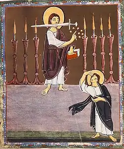 Espada aguda de dos filos que sale de su boca | «Su Palabra que trabaja para salvar y para destruir».[4] |