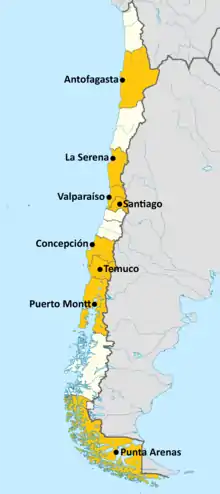 Ubicación | Santiago, Valparaíso, Punta Arenas, Puerto Montt, Concepción, Temuco, La Serena, Antofagasta. | ||||
