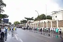 Desde ahí se trasladó en el papamóvil rumbo a la Nunciatura Apostólica, sitio de alojamiento que tuvo durante su estadía de tres días, saludando durante todo su trayecto a miles de devotos apostados a la vera del camino formando un cordón de honor.[10] En el medio, se detuvo brevemente frente a la cárcel de mujeres del Buen Pastor donde fue recibido por la ministra de Justicia, Sheila Abed, junto a un coro de 50 reclusas del penal.[11]
