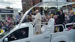 El papamóvil preparado para esta oportunidad se trató de una camioneta Isuzu D-max del año 2015, con doble cabina, adaptada para albergar el asiento papal, el cual fue giratorio con el fin de que Francisco descienda por la escalinata para saludar a los fieles.
