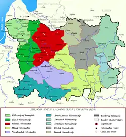 ![]() Voivodato de Vilna en rojo. Las fronteras del voivodato no cambiaron desde la Unión de Lublin. | |||||||||||||||||||||||||||||||