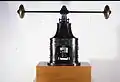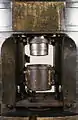 Está compuesto de un husillo, dos brazos y dos bolas de plano al fin de ellos, una pieza que llaman sortija que une por medio de una muesca a la que llaman ranura, el husillo y la caja superior en que está puesto el cuño de arriba o superior; de unos ramales para que tire el trabajador; de unas tablas por donde sube y baja la caja superior y que tienen también un encaje o ranura por donde están enranuradas con el cuerpo del volante y de un cepo donde cae la moneda acuñada.