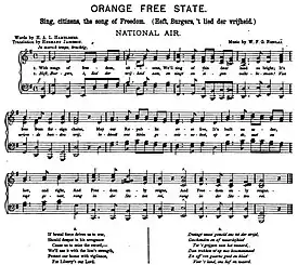 - Esta obra contiene una traducción parcial derivada de «National anthem of the Orange Free State» de Wikipedia en inglés, concretamente de esta versión del 16 de septiembre de 2018, publicada por sus editores bajo la Licencia de documentación libre de GNU y la Licencia Creative Commons Atribución-CompartirIgual 3.0 Unported.