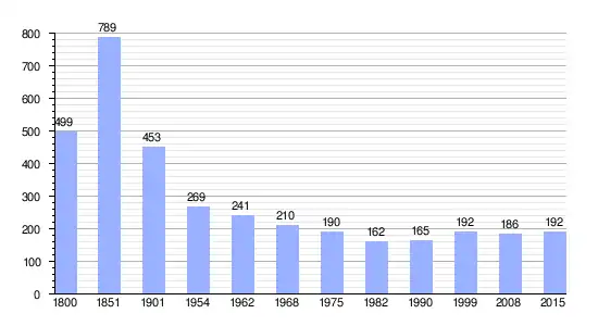 Los datos entre 1800 y 2015 son el resultado de sumar los parciales de las dos comunas que forman la nueva comuna de Vosbles-Valfin, cuyos datos se han cogido de 1800 a 1999, para las comunas de Valfin-sur-Valouse[4]y Vosbles[5]de la página francesa EHESS/Cassini. Los demás datos se han cogido de la página del INSEE.[6]