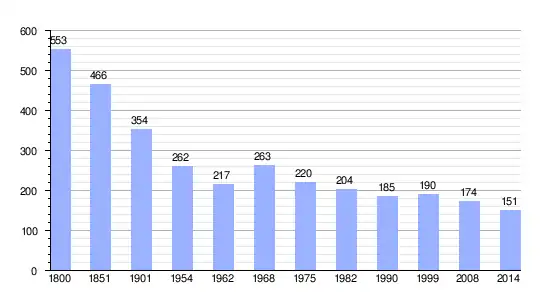 Los datos demográficos contemplados en este gráfico de la comuna de Vouilly[4] se han cogido de 1800 a 1999 de la página francesa EHESS/Cassini, y los demás datos de la página del INSEE.[5]