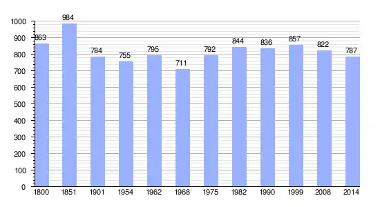 Los datos demográficos contemplados en este gráfico de la comuna de Vouvray-sur-Loir[4] se han cogido de 1800 a 1999 de la página francesa EHESS/Cassini, y los demás datos de la página del INSEE.[5]