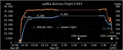 A las 02:54:47 los registros del FDR indican alarma "master warning" y una reducción de potencia en el motor #1 del 39,5% al 29%. A las 02:55:04 se apaga el motor #2 y a las 02:55:41 se apaga el motor #1. A las 02:57:10 el piloto del LMI2933 informa "falla total, sin combustible" y a las 02:58:42 se escucha la última comunicación del piloto solicitando "vectores", no respondiendo el piloto a los subsecuentes llamados del ATC Medellín.[38]