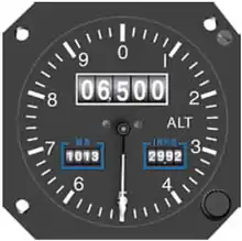 Esquema de un altímetro de avión tipo tambor, que muestra las pequeñas ventanas Kollsman en la parte inferior izquierda e inferior derecha de la cara.
