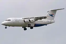 El BAe 146 es un avión diseñado específicamente para operaciones de pista corta. Equipado con cuatro motores de turbofan con engranaje Avco Lycoming ALF502R-5, el avión está diseñado para aterrizajes planos, donde los trenes de aterrizaje principal y de nariz golpean la pista casi simultáneamente. Tiene potentes frenos de ruedas y frenos de aire, con grandes alerones para volcar el elevador inmediatamente al aterrizar, pero carece de inversores de empuje.